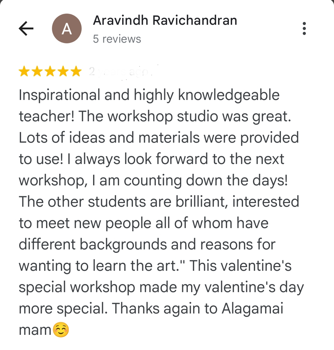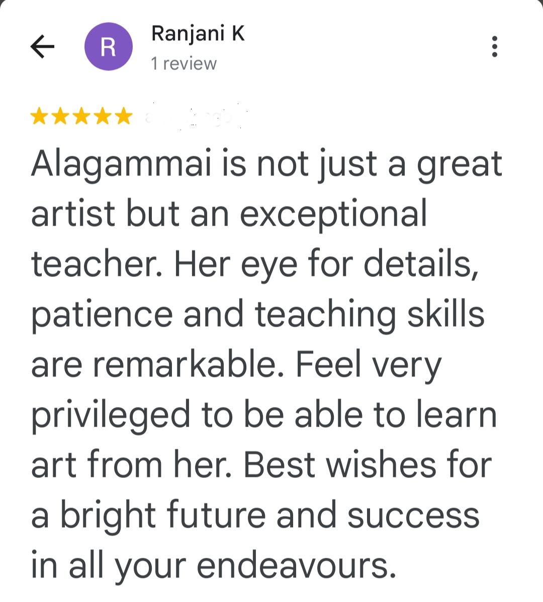 Alagammai’s work has garnered recognition at international and national exhibitions held in Hyderabad, Chennai, and Coimbatore. Her meticulous nature and unwavering determination are evident in every brushstroke.