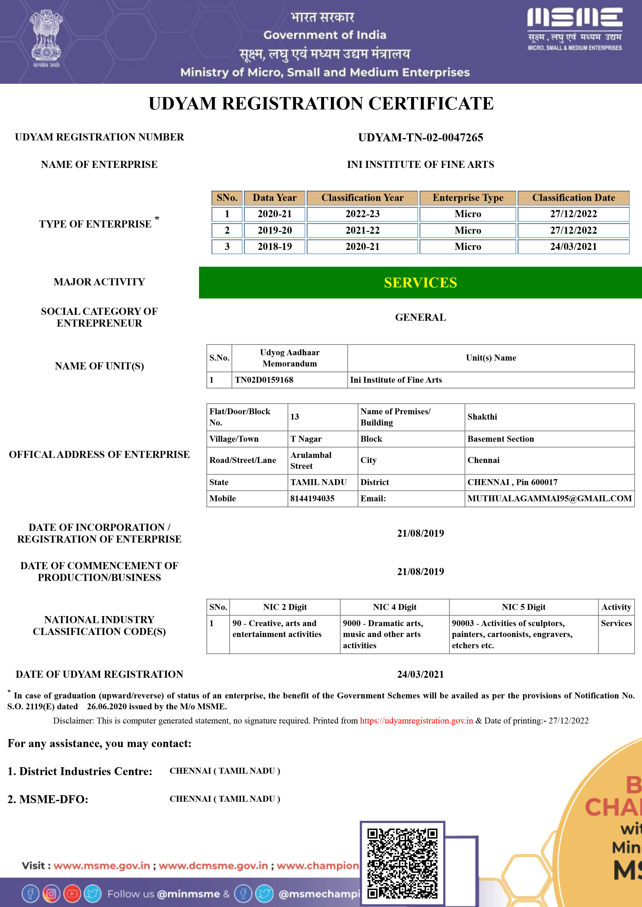 Ini Institute of Fine Arts is a Government Registered Institute. Our Registration Number is UDYAM-TN-02-0047265. We strive hard to help the students learn and enjoy the art to the fullest. We make sure that they reach their fullest potential in their art work irrespective of their age.